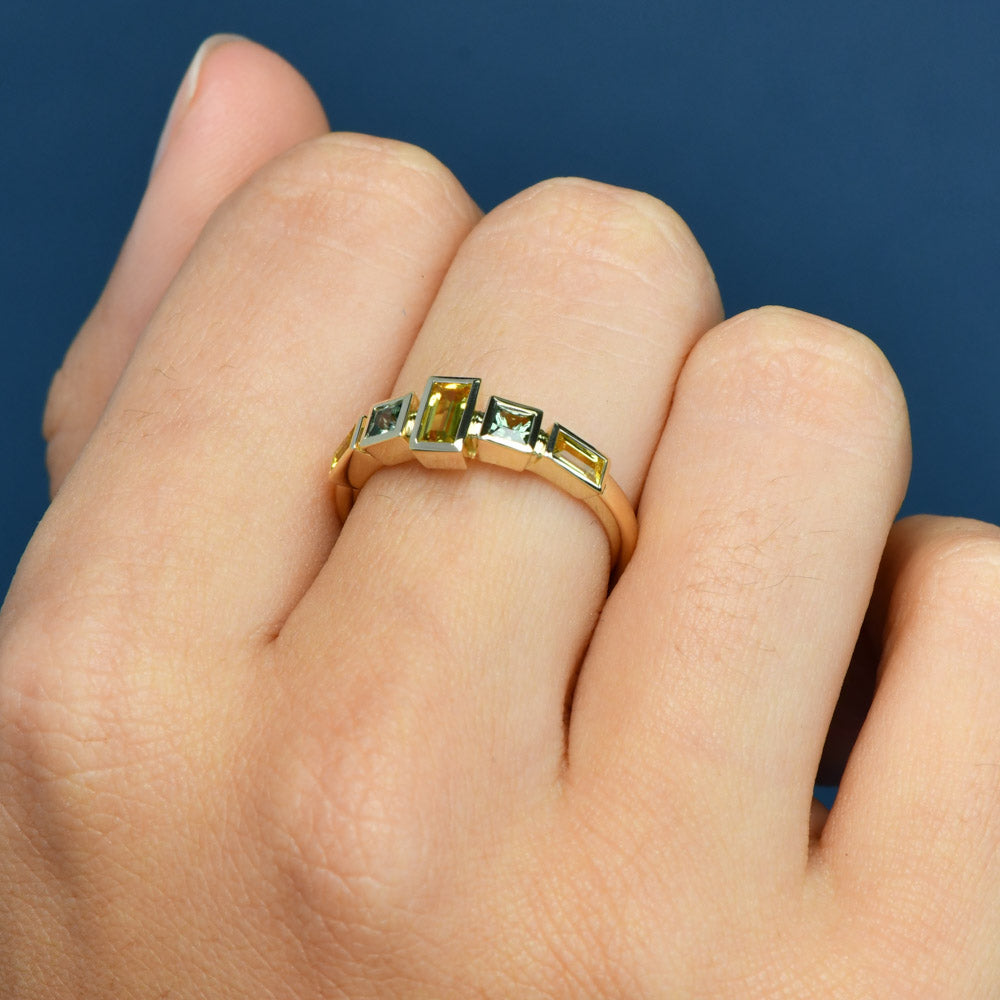 The Emory ring features a striking array of Australian sapphires, each in a modern, unique bezel setting. This piece is available in a variety of colours and shapes, allowing you to find the perfect piece to match your style!